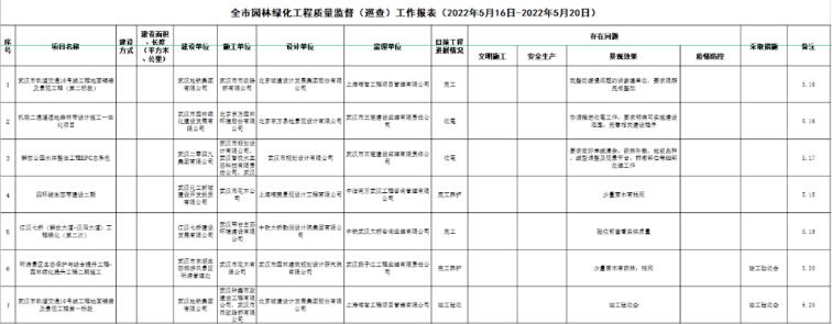 為爭創(chuàng)國家生態(tài)園林城市、國際濕地城市,努力打造濕地花城,推進碳中和、碳達峰,建設(shè)美麗武漢。在2022年,以咬定青山不放松,風雨無阻向前進,推動武漢園林和林業(yè)事業(yè)高質(zhì)量發(fā)展為奮斗目標,2022年5月16日至5月20日對全市7個在建綠化建設(shè)項目開展質(zhì)量監(jiān)督(現(xiàn)場巡查)工作,現(xiàn)將有關(guān)情況通報如下: