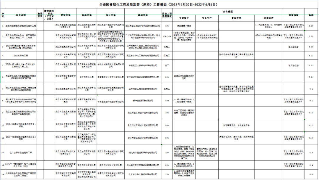 本周共下達(dá)《武漢市園林綠化工程質(zhì)量整改通知》7份,竣工驗(yàn)收項(xiàng)目2個(gè)。