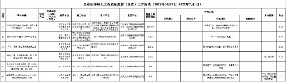 本周共下達(dá)《武漢市園林綠化工程質(zhì)量整改通知》1份,竣工驗(yàn)收項(xiàng)目1個(gè)。